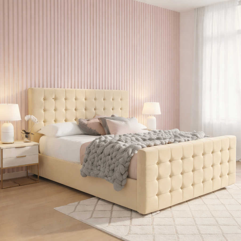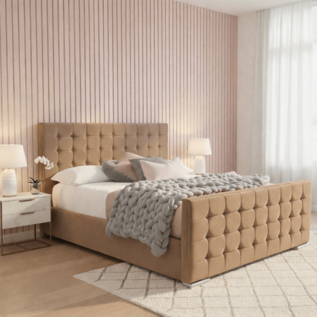 Embrace minimalist elegance with our Cube Divan Bed. Characterised by its clean lines and a sophisticated biscuit-tufted design, this bed brings a serene, hotel-chic vibe to any bedroom. Exclusively upholstered in your choice of our finest velvets, the Cube bed is a masterclass in modern design, offering a plush, deeply padded surface perfectly paired with practical divan storage options.