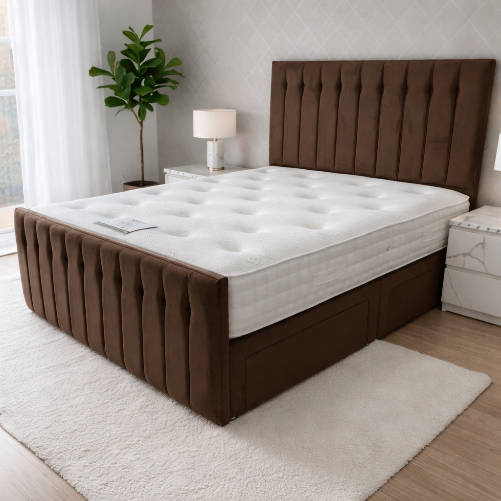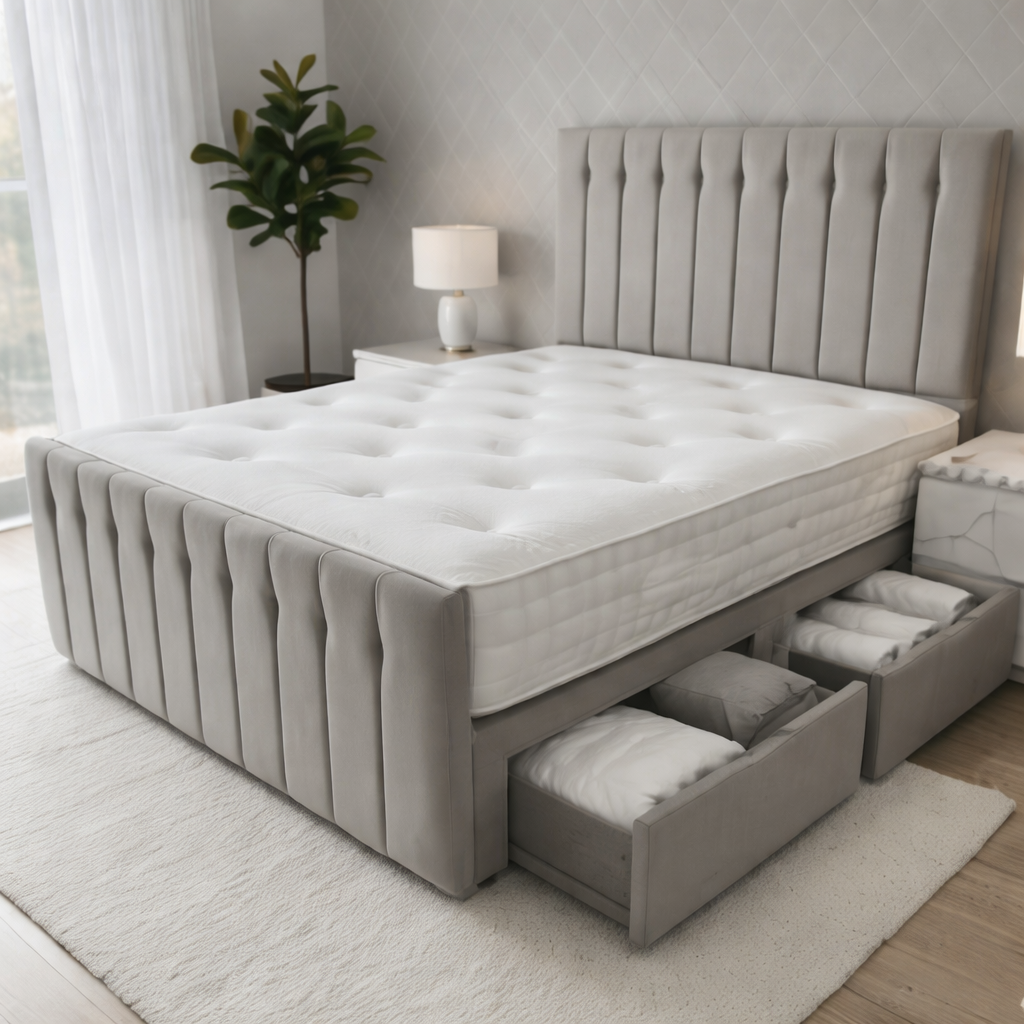 Sparrow Divan Bed is more than just a place to sleep — it’s a beautifully designed storage solution, handcrafted with care and precision in the UK. The bed features a refined box pattern design that adds texture and sophistication to any bedroom space. Wrapped in durable, strong fabric and mounted on elegant chrome gliders. It supports all UK standard-size mattresses and can be paired with our signature headboards for a premium, coordinated look. Rest assured that every inch is made to offer support, longevity, and visual appeal.